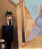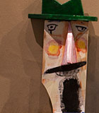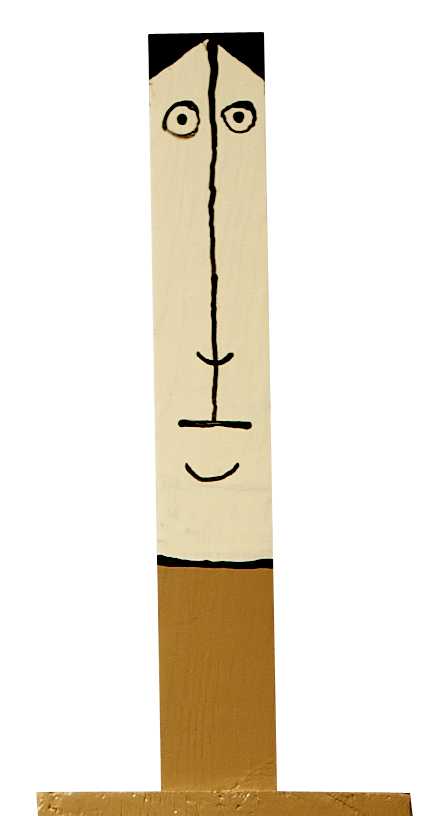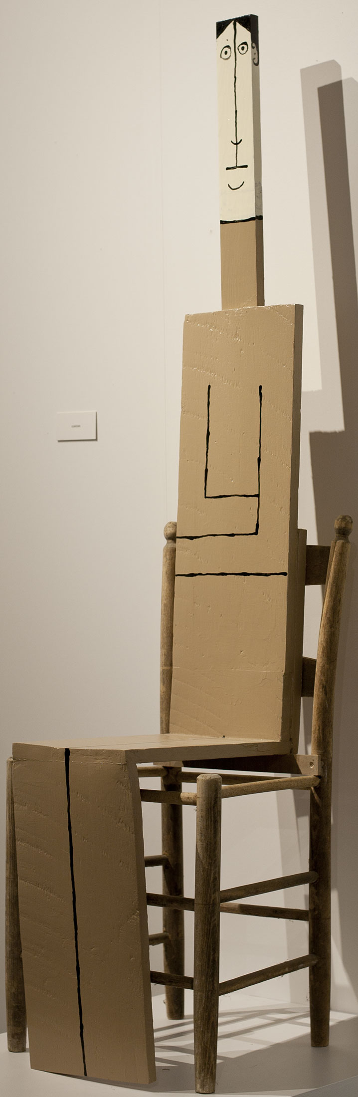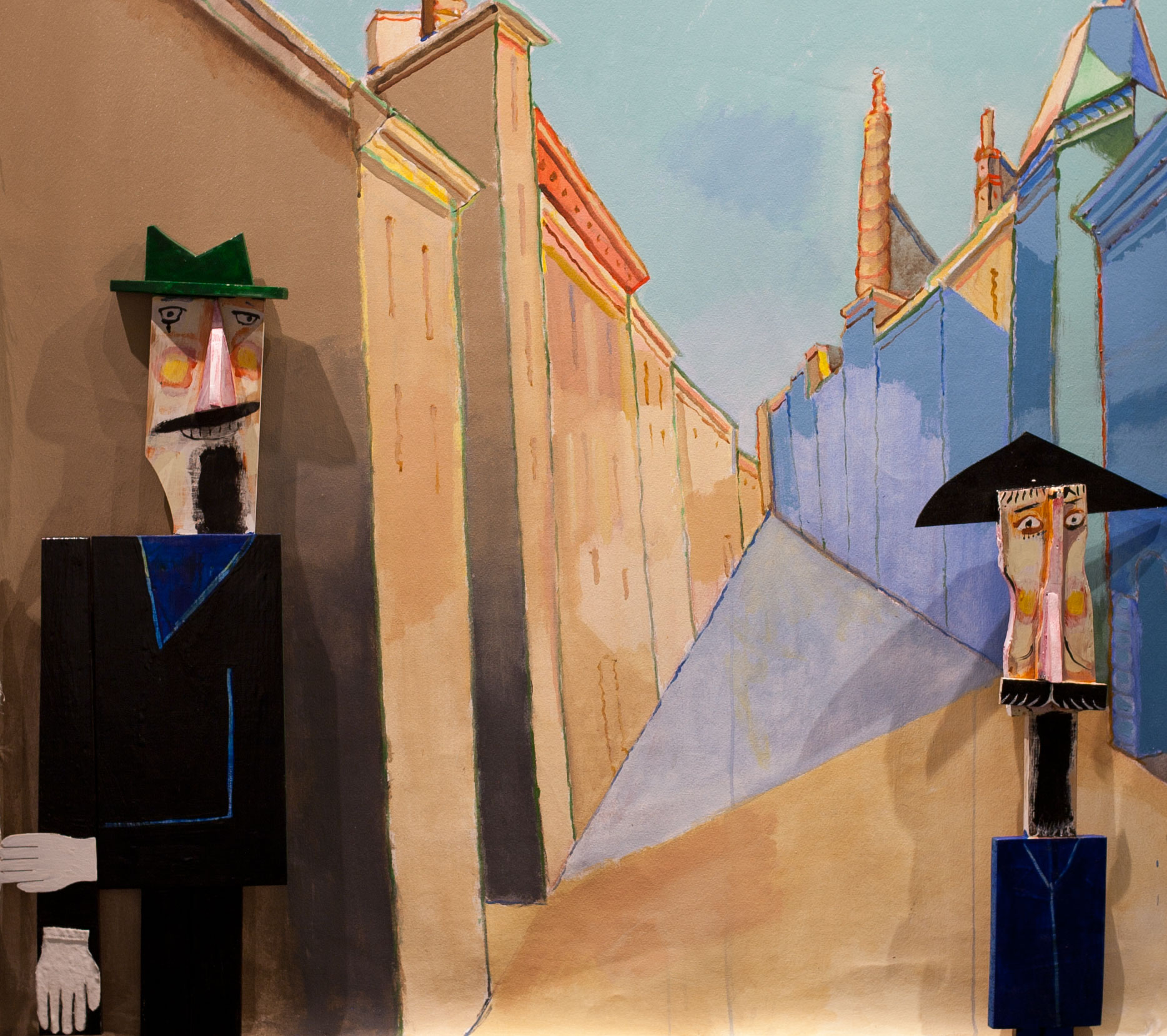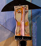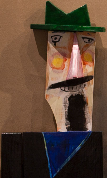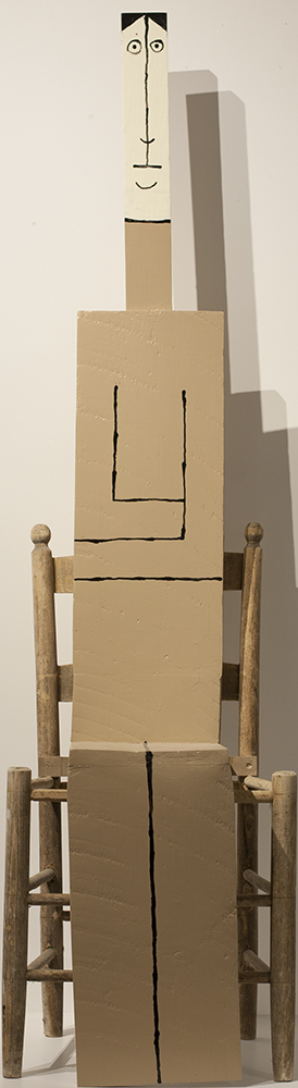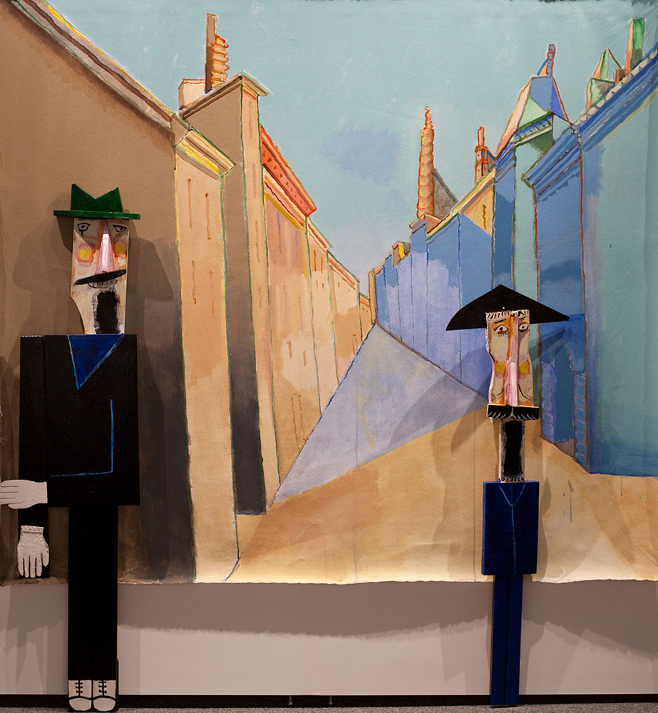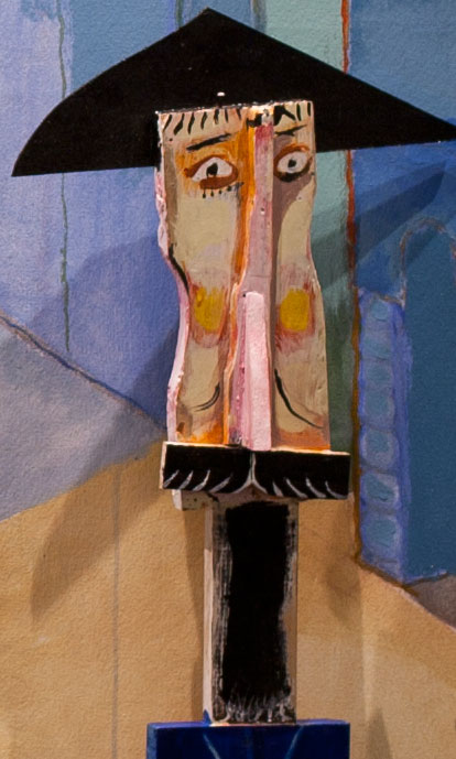 acrylic on canvas and 2 wood figures, 5’ x 6’